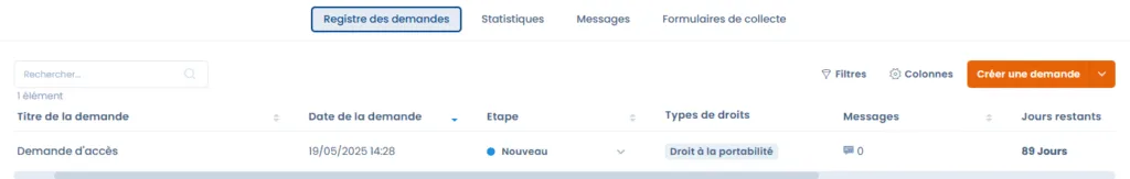 Dastra permet de centraliser les demandes des personnes concernées, qu’il s’agisse d’un droit d’accès, de rectification, de suppression ou d’opposition. Une fois saisie, chaque demande peut être qualifiée, assignée à un responsable, et suivie jusqu’à sa clôture. Un tableau de bord permet de suivre les délais légaux, tout en conservant une traçabilité des actions réalisées, ce qui est utile en cas de contrôle.