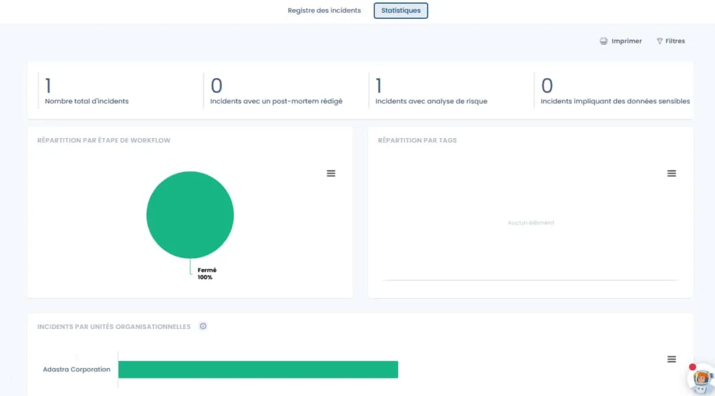 Le module “incidents” permet de documenter les violations de données personnelles, d’en évaluer les conséquences et d’assurer un suivi jusqu’à la résolution. L’outil guide l’utilisateur dans la qualification de l’incident, l’évaluation du risque pour les personnes concernées, et la décision de notifier (ou non) la CNIL.