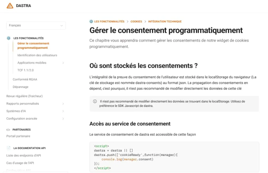 ⚙️Pour les équipes techniques, Dastra propose également un mode d’intégration avancé via API ou JavaScript, permettant de gérer le consentement de manière programmatique. Cette approche est utile pour les environnements complexes, les applications web spécifiques, ou les cas nécessitant un déclenchement conditionnel.